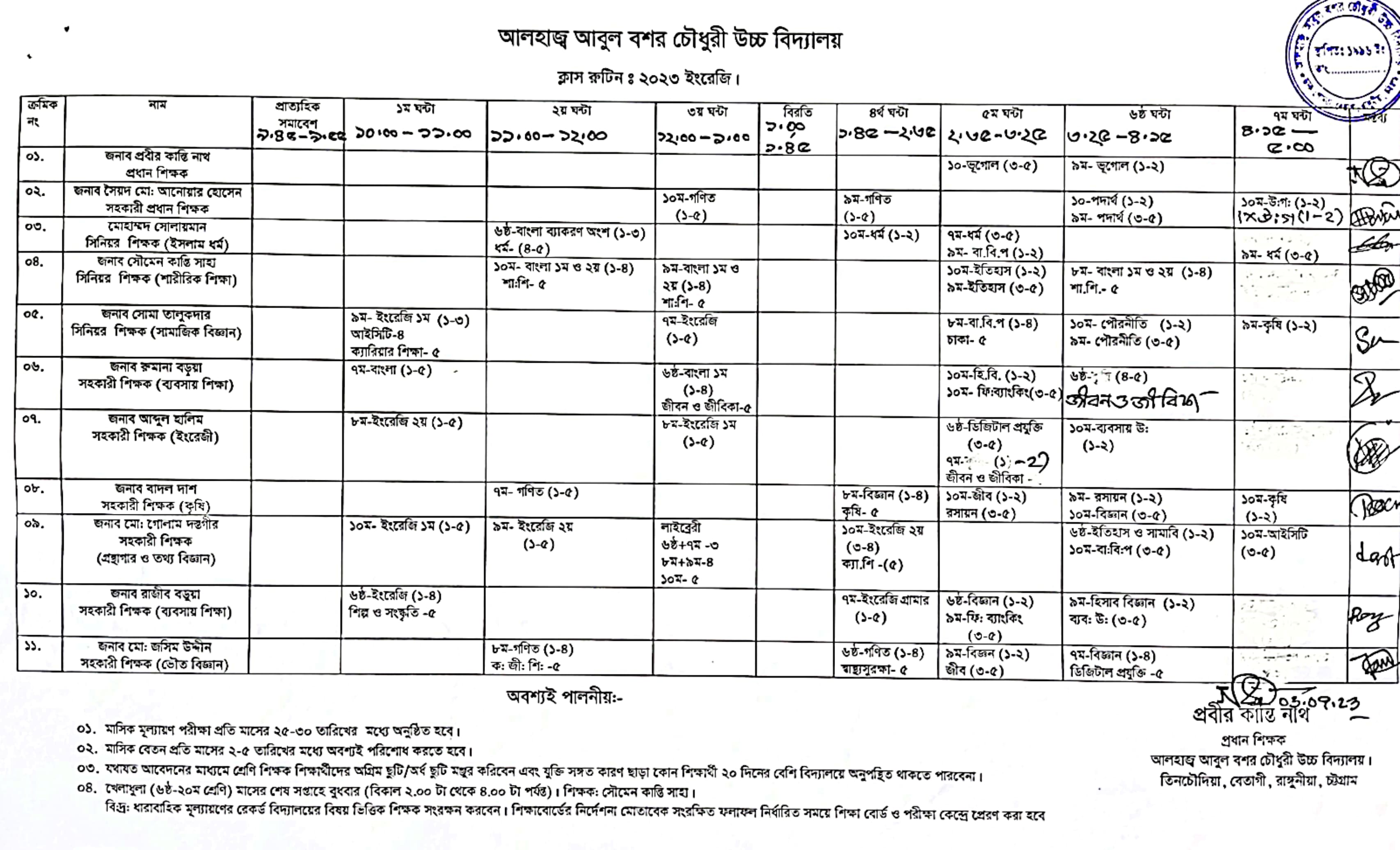 Class Routine 2023 for all classes